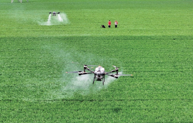 2025年4月18日,在山東省聊城市茌平區(qū)樂平鋪鎮(zhèn)大尉莊村高標準農(nóng)田里,技術(shù)人員操作植保無人機進行小麥“一噴三防”作業(yè)。